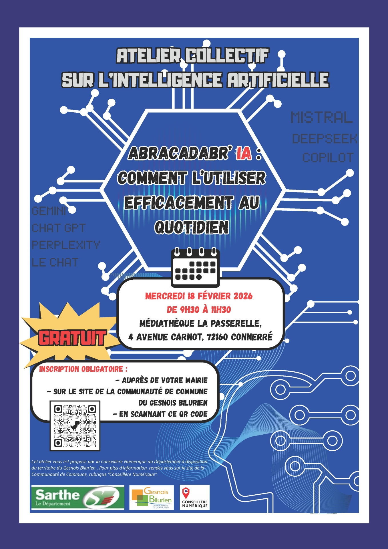 Cet atelier a pour objectif de démystifier l’IA et de montrer comment des outils comme ChatGPT, Gemini, Copilot, Perplexity, Mistral, DeepSeek ou encore Le Chat peuvent devenir de véritables alliés au quotidien. Que vous soyez débutant ou simplement curieux, l’atelier est conçu pour être clair, interactif et accessible, sans prérequis techniques.