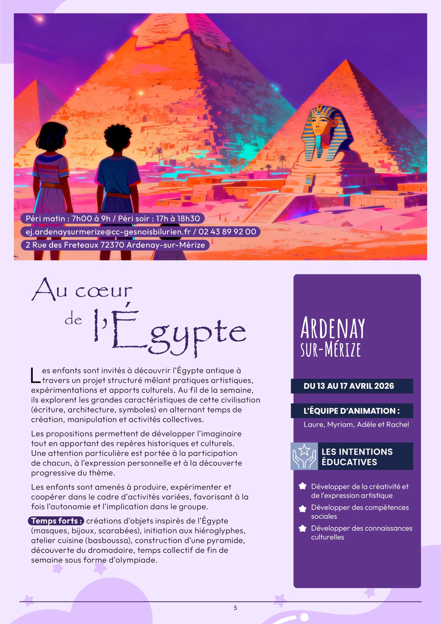 Découverte de l’Égypte antique à travers des activités créatives, culturelles et collectives autour de ses symboles et traditions.