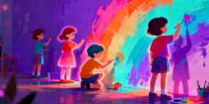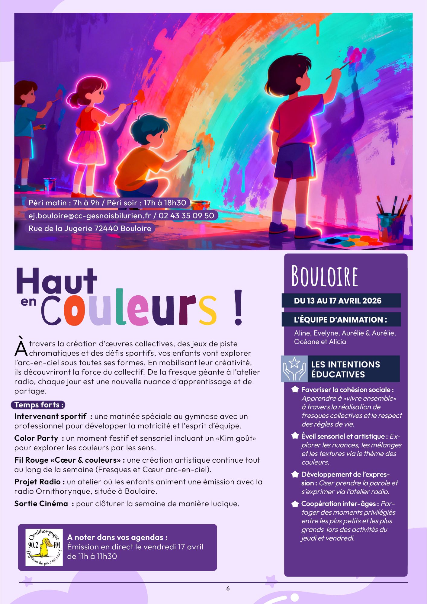 Exploration ludique des couleurs à travers des activités artistiques, sportives et une expérience radio favorisant créativité et expression.