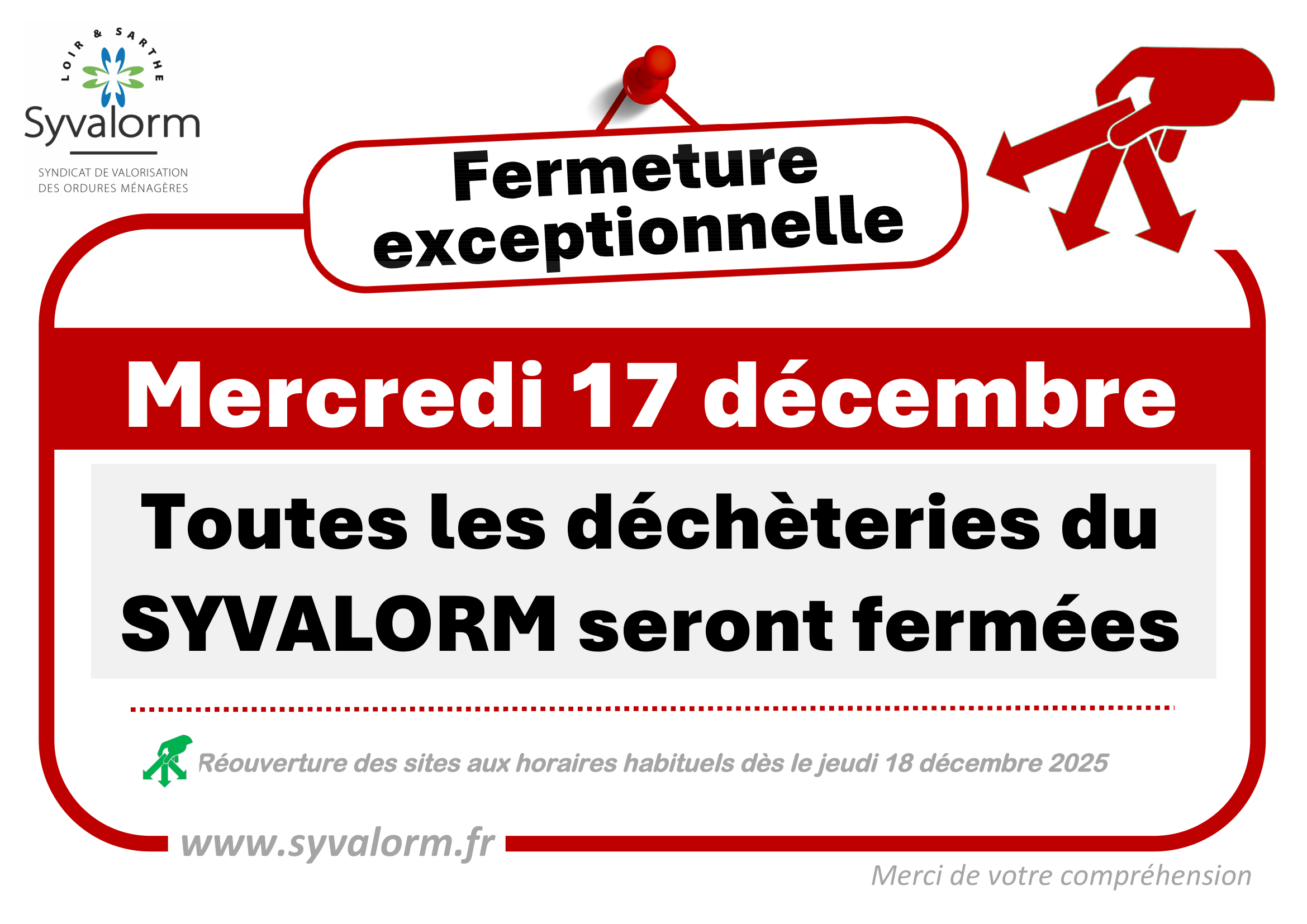 Toutes les déchèteries du SYVALORM seront fermées le mercredi 17 décembre 2025.