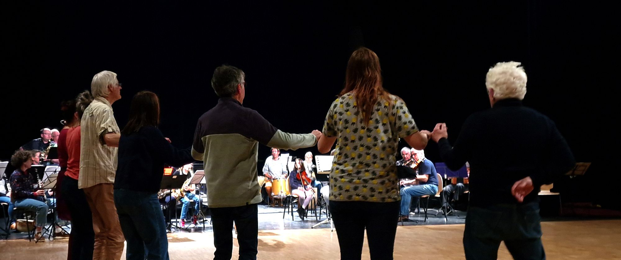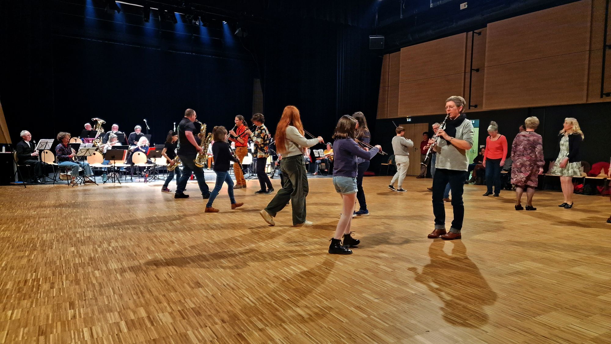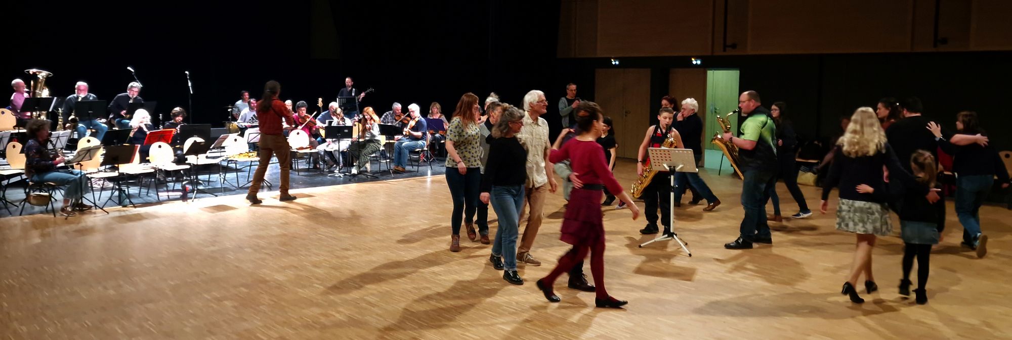 En fin de journée, le travail réalisé a pris toute sa dimension lors du concert-bal organisé à la salle de la Passerelle. Les musiciens ont accompagné une trentaine de danseurs sur des danses accessibles à tous : cercles, bourrées ou encore danses collectives comme le Capitaine trompeur, permettant même aux novices de rejoindre rapidement la piste. Le bal a rassemblé un public intergénérationnel, mêlant enfants, adultes et danseurs plus expérimentés. Entre sourires, transmission spontanée et plaisir partagé, chacun a trouvé sa place sur la piste, porté par l’énergie du groupe.